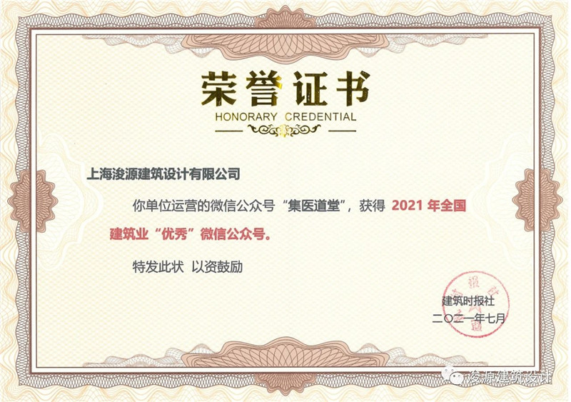 7月16日,由建筑時(shí)報(bào)社主辦的2021年建筑業(yè)微信公眾號運(yùn)維經(jīng)驗(yàn)交流研討會暨全國建筑業(yè)優(yōu)秀公眾號頒獎(jiǎng)典禮在江蘇省揚(yáng)州市召開。會議以“迭代傳播方式,賦能品牌價(jià)值”為主題,兩百九十余位來自全國各地建筑業(yè)協(xié)會、企業(yè)宣傳和新媒體崗位的負(fù)責(zé)人匯集一堂,共同探討建筑行業(yè)新媒體內(nèi)容生產(chǎn)和推廣運(yùn)營的經(jīng)驗(yàn)。由上海浚源建筑設(shè)計(jì)有限公司運(yùn)營的“集醫(yī)道堂”微信公眾號榮獲2021年全國建筑業(yè)“優(yōu)秀”微信公眾號。