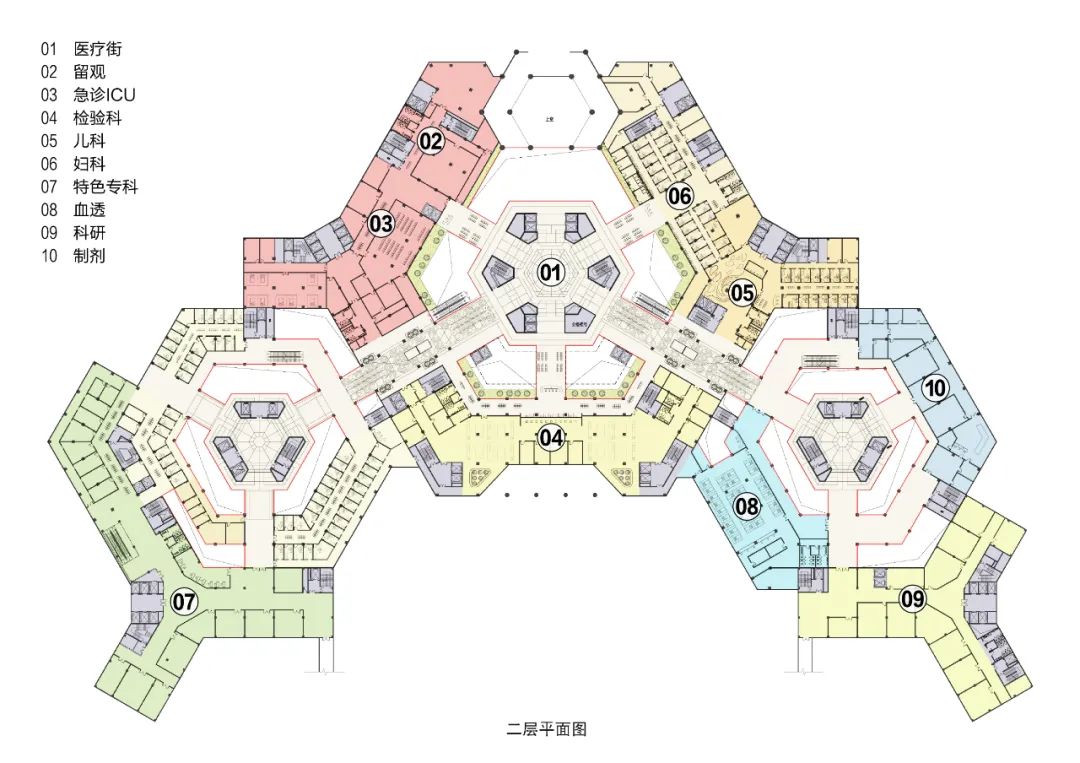 在功能布局中,首先三等分平面,使三個功能區(qū)相互獨立,通過核心的“醫(yī)療街”緊密聯(lián)系;并且整合各科室,定量標準化診室面積,使用功能,輔助用房等,靈活組合以應對不同需求的功能。在各功能區(qū)內(nèi),各科室可靈活調(diào)換位置,增減面積。