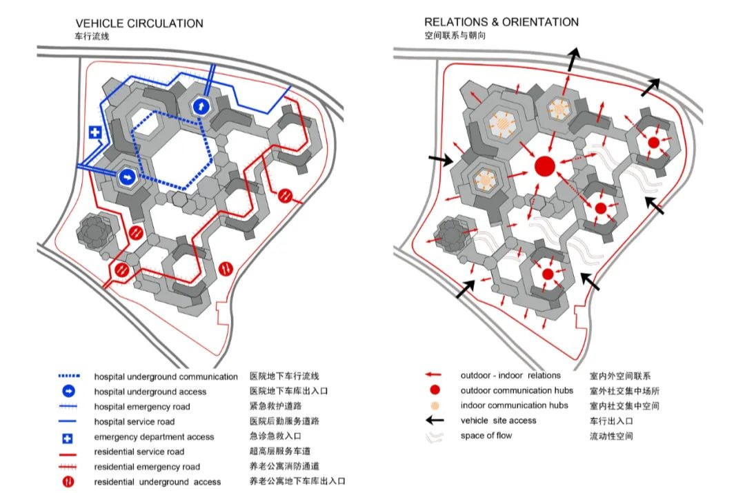 項目3.5容積率,及除超高層外限高80米的規(guī)劃要求。我們以功能、日照、視野、均好性為出發(fā)點。嘗試醫(yī)院運行維度特別是醫(yī)療功能之間的高效復合,采用垂直疊加的方式選用點式Y型高層病房合理組織門診醫(yī)技裙房功能,高效利用地下空間作為醫(yī)療功能的有益補充實現(xiàn)醫(yī)療功能之間的高效復合。養(yǎng)老區(qū)塊形成三大組團配合150米的超高層精品養(yǎng)老,采用獨有的養(yǎng)老服務體系實現(xiàn)醫(yī)養(yǎng)功能的有效復合。