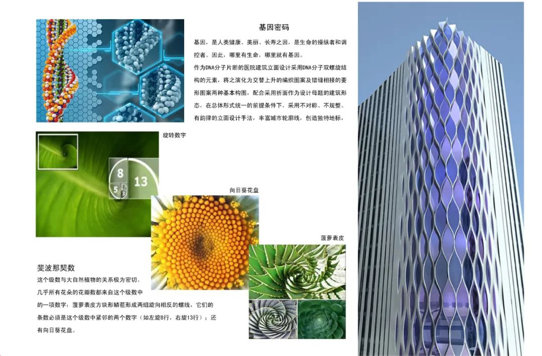 醫(yī)院建筑立面設計采用DNA細胞分子雙螺旋結構的元素,將之演化為交替上升的編織圖案及錯縫相接的菱形圖案兩種基本構圖,配合采用折面作為設計母題的建筑形態(tài)輔以極簡潔的橫線條和豎線條相結合,體現(xiàn)了銀葵醫(yī)院的國際化與科技感??紤]病房樓的內(nèi)部功能和窗的規(guī)整,上部建筑立面大面積采用豎向條,下部建筑以醫(yī)院為主考慮到其功能特性和為后面內(nèi)部變化的變量,外立面采用橫向條設計,在總體形式統(tǒng)一的前提條件下,創(chuàng)造獨特地標,豐富城市輪廓線,成為一道別具一格的風景。
