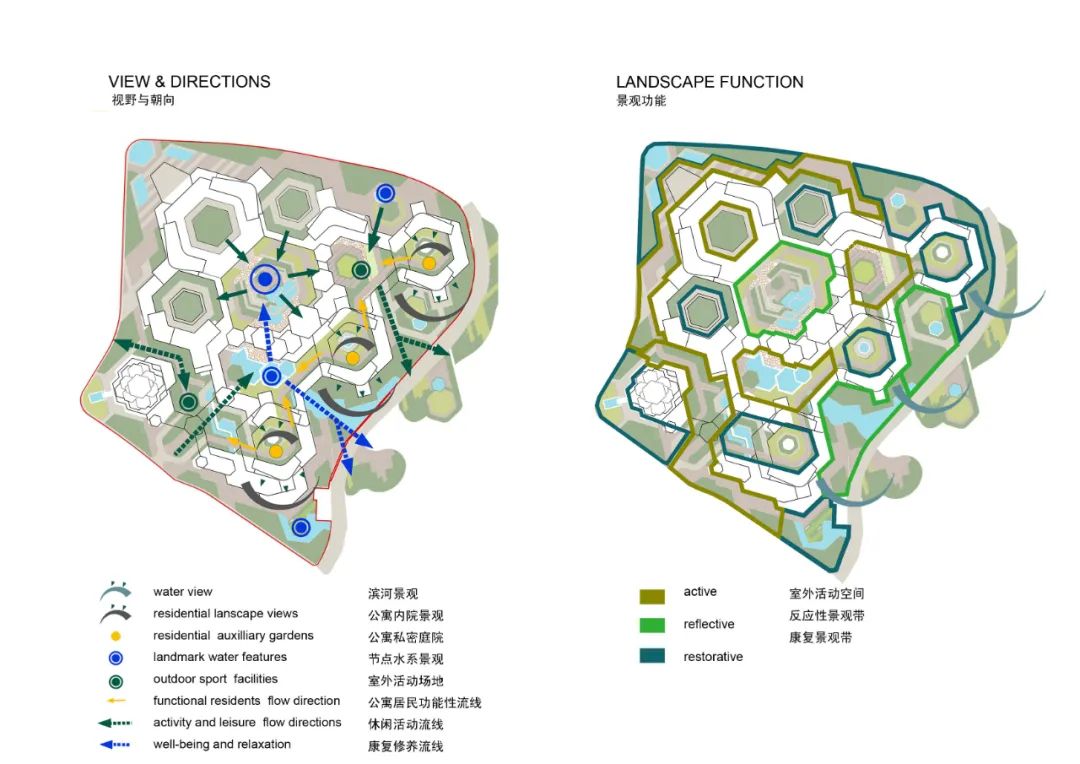 結合南方地區(qū)特有氣候條件,充分考慮場地限制和使用人群的需求,將景觀滲入整個設計中,形成“多層次多維度”的景觀空間體系。結合下沉空間、地面、屋頂?shù)雀卟钭兓?,打造出中心廣場與院落的室外活動空間,中心綠地與親水河畔的反應性景觀帶,以及內(nèi)部庭院的康復景觀帶,為居民提供免費的運動,文化和社交場所,串聯(lián)出“多維度多層次”的景觀空間。
