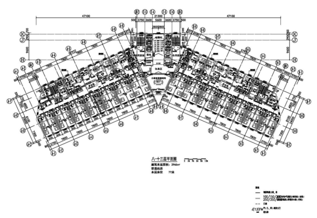 中山醫(yī)院醫(yī)療科研綜合樓集醫(yī)療與科研功能為一體,采用鋼筋混凝土框架-剪力墻結(jié)構(gòu)。大樓南北向布置,東西方向總長度為115.5 米,南北方向總寬度為66.5 米。地上20 層,裙房7 層,建筑高度87.950 米。裙房平面呈鉆石形,裙房以上主樓呈V形展開,夾角成132°。1~7層包含外科手術(shù)室、ICU、病理科等功能,8層以上為婦產(chǎn)科、外科、臨床驗證平臺病房等功能。裙房以下和以上房間布置差異大,從基礎(chǔ)通至主樓頂?shù)募袅H有北側(cè)樓電梯間和山墻局部部位可以布置,八層以上主樓沿橫向剛度偏弱,結(jié)構(gòu)抗扭轉(zhuǎn)能力欠缺。需要適當(dāng)調(diào)整上部樓層的剛度分布,改善建筑抗震性能。