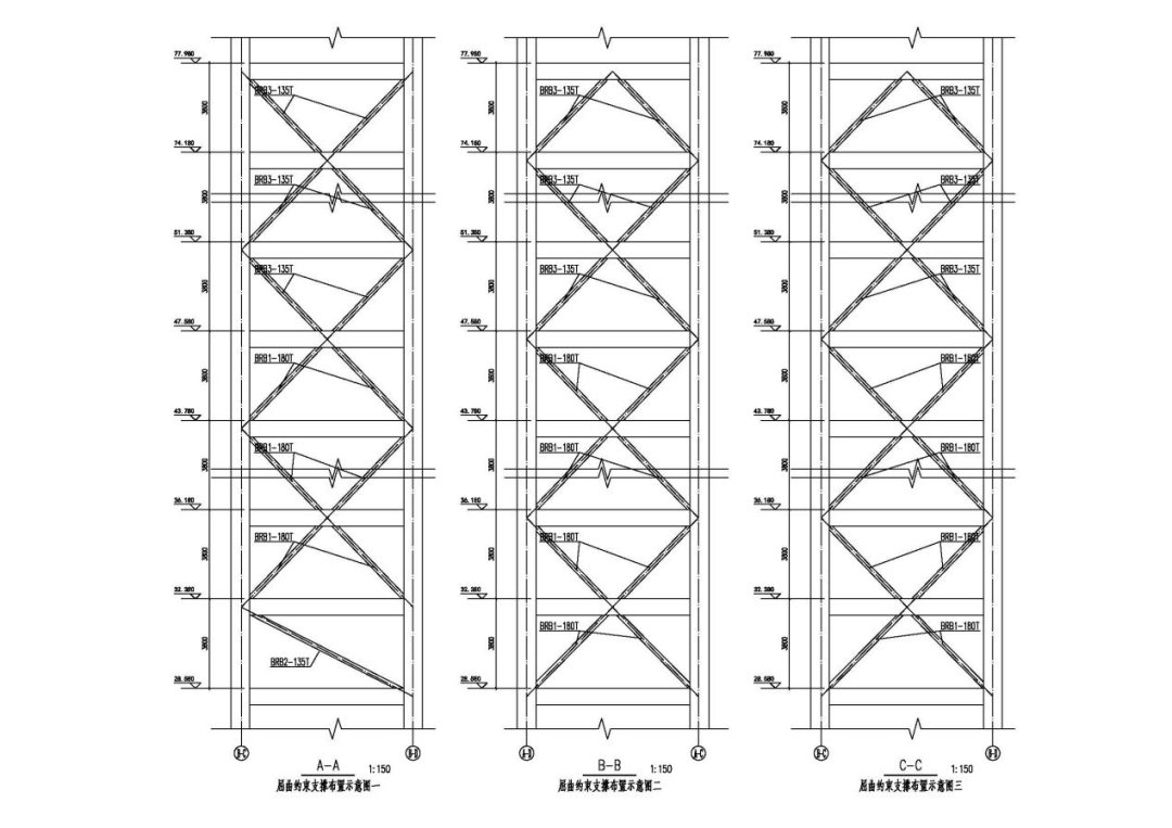 為進(jìn)一步了解屈曲約束支撐在各階段進(jìn)入屈曲的情況,采用PROFORM-3D軟件補(bǔ)充罕遇地震作用下屈曲支撐的彈塑性計算分析。屈曲支撐在多遇地震狀態(tài)下彈性,調(diào)節(jié)結(jié)構(gòu)扭轉(zhuǎn)變形;在設(shè)防地震和罕遇地震下部分支撐進(jìn)入屈服,但未破壞,仍有剛度和承載力。由于屈曲約束支撐具有明確的屈服承載力,在大震下可起到“保險絲”的作用,保護(hù)主體結(jié)構(gòu)在大震下不屈服或者不嚴(yán)重破壞。大震后,可以方便地更換損壞的支撐,恢復(fù)結(jié)構(gòu)抗震性能。