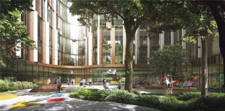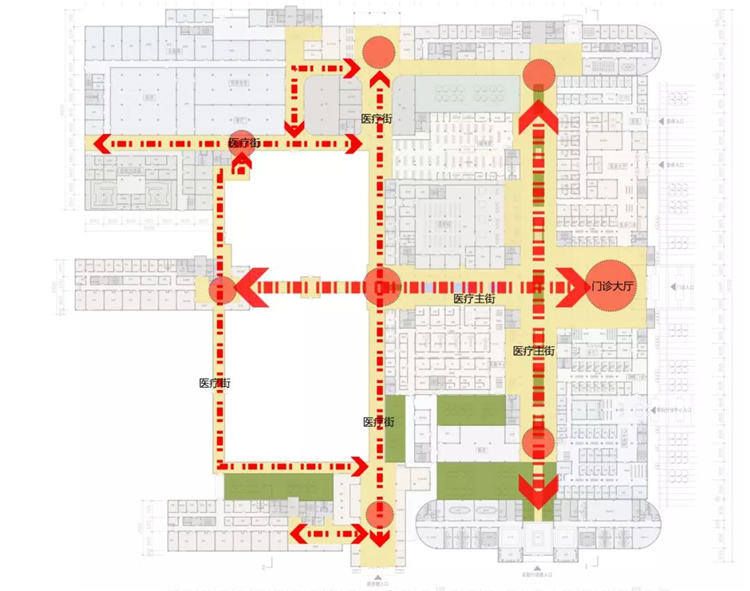 對醫(yī)院建筑內(nèi)部公共空間的交通設計應遵守以人為本的理念,采用體驗式、情景化的設計。各個功能區(qū)通過南北、東西兩條通廊進行串聯(lián),以在內(nèi)部形成回路,實現(xiàn)整個建筑內(nèi)部交通組織順暢,門診、醫(yī)技和住院等空間的布置應組團圍繞這兩條醫(yī)院街進行布置。中庭空間和公共交通在醫(yī)院街組織內(nèi)部布設,提供便捷高效的內(nèi)部交通組織,還豐富著建筑空間,將舒適宜人的內(nèi)部景觀環(huán)境引入建筑內(nèi)部,讓陽光與綠色紛呈。延伸至地下一層的醫(yī)療街仿佛變身成了極具煙火氣的“網(wǎng)紅夜市”。