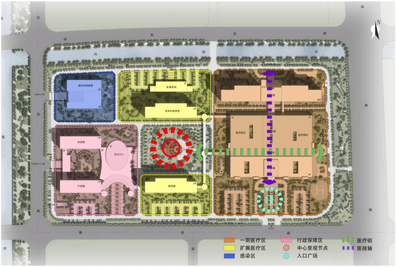 建設(shè)用地呈較為規(guī)整的長(zhǎng)方形,考慮到分期建設(shè)和實(shí)際使用的要求,我們選擇了從東向西有序發(fā)展的布局模式,醫(yī)療區(qū)、擴(kuò)展醫(yī)療區(qū)、行政保障區(qū)和感染區(qū),疏密相間,流線(xiàn)緊湊。一期規(guī)劃的醫(yī)療區(qū)位于地塊東面緊鄰東風(fēng)南路一側(cè),門(mén)急診、醫(yī)技樓、病房樓沿南北向“醫(yī)療主軸”依次展開(kāi),門(mén)急診部、醫(yī)技部間以東西向“醫(yī)療街”為界,地塊中心位置圍合形成大型中央庭院,綠化、水系、園路和小品共同構(gòu)建出尺度適宜、環(huán)境宜人的就醫(yī)環(huán)境。