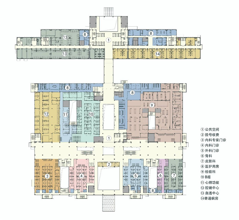 對(duì)應(yīng)疏導(dǎo)大型醫(yī)院復(fù)雜的人流,“醫(yī)療主軸”和“醫(yī)療街”,都是不可或缺的構(gòu)成部分。門(mén)急診部、醫(yī)技部與住院部自南向北依次排開(kāi),以“醫(yī)療主軸”中心串聯(lián),各功能空間由“醫(yī)療主軸”有機(jī)聯(lián)系,達(dá)成分而不離的效果。沿主軸上依次布置了門(mén)診大廳、導(dǎo)醫(yī)分診、掛號(hào)收費(fèi)、住院大廳等公共開(kāi)敞服務(wù)空間。門(mén)急診部與醫(yī)技部則以東西向“醫(yī)療街”為聯(lián)接體,相互對(duì)應(yīng),流線(xiàn)便捷。同時(shí)“醫(yī)療街”作為門(mén)診部與醫(yī)技部空間的過(guò)渡和分隔,有效明確了功能分區(qū),達(dá)到合而有別的效果。四層通高大空間設(shè)計(jì)的“醫(yī)療主軸”和“醫(yī)療街”,通透、開(kāi)敞、明亮,與室外的庭院空間相互滲透,共同構(gòu)成了綠色的、流動(dòng)的就診空間。在一層設(shè)置了景觀(guān)綠帶,結(jié)合休息、等候、書(shū)報(bào)亭、售品店、餐飲等,營(yíng)造了舒適,安靜的就診環(huán)境。二至四層則通過(guò)空中連廊、垂直交通、自動(dòng)扶梯等,高速有序的疏導(dǎo)醫(yī)患人流。