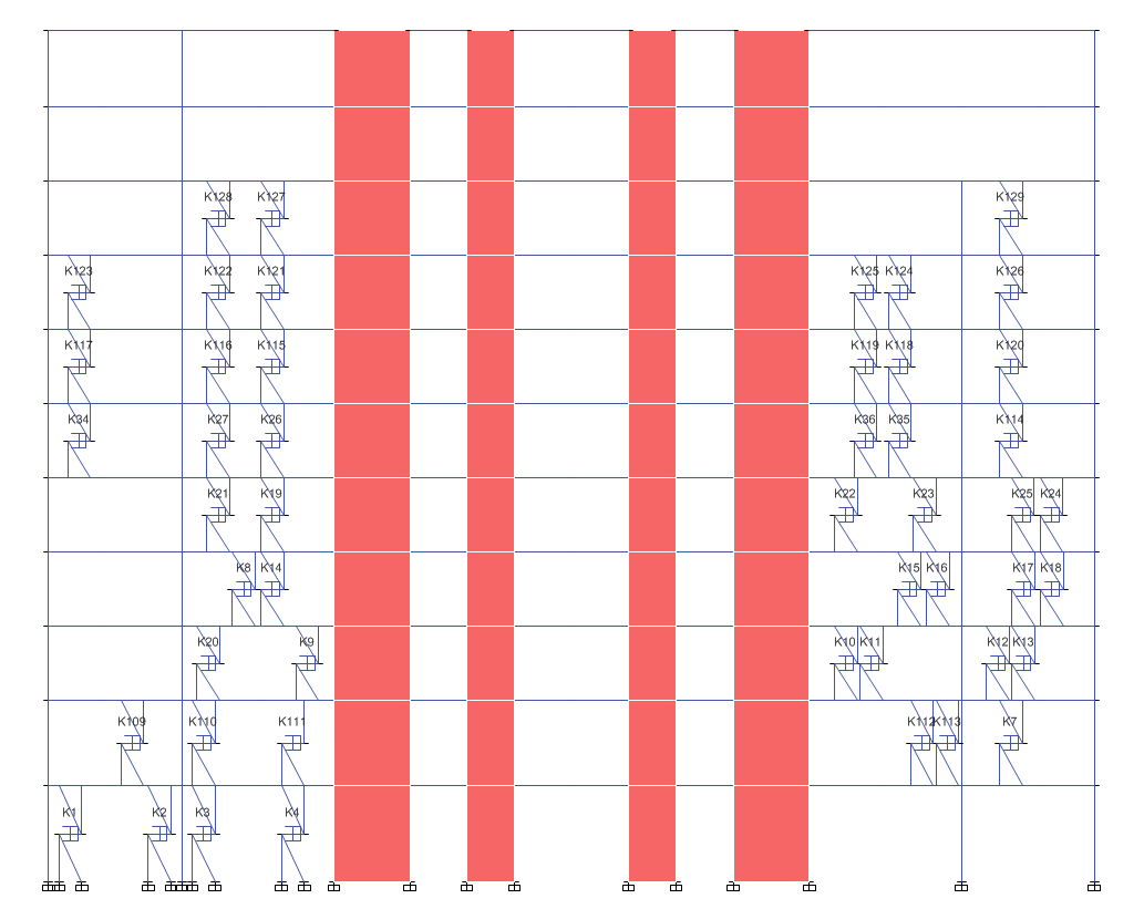 阻尼器的平面內(nèi)布置位置應(yīng)盡量遵循“均勻、分散、對(duì)稱”的原則,本項(xiàng)目中典型樓層及部位阻尼器布置情況見(jiàn)下圖。