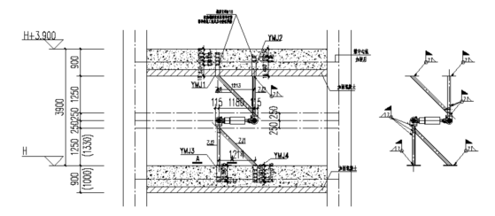 為保證阻尼器充分發(fā)揮作用,《建筑消能減震技術(shù)規(guī)程》和《建筑消能減震應(yīng)用技術(shù)規(guī)程》中對(duì)子結(jié)構(gòu)的設(shè)計(jì)均提出一定的要求:消能子結(jié)構(gòu)中梁、柱和墻構(gòu)件宜按重要構(gòu)件設(shè)計(jì),并應(yīng)考慮罕遇地震作用效應(yīng)和其他荷載作用標(biāo)準(zhǔn)值的效應(yīng),其值應(yīng)小于構(gòu)件極限承載力。為此,首先需保證阻尼器與原結(jié)構(gòu)有可靠連接,通過(guò)與支撐相連的框架梁、柱的性能水平,考察各消能子框架在大震作用下是否能達(dá)到既定的性能目標(biāo)。