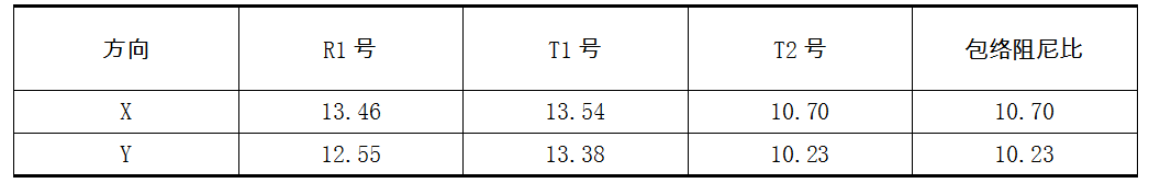 下表為軟件計(jì)算得到的附加阻尼比,可知X和Y方向的最小附加阻尼比分別為10.70%和10.23%,整體結(jié)構(gòu)計(jì)算時(shí)取附加阻尼比9%。