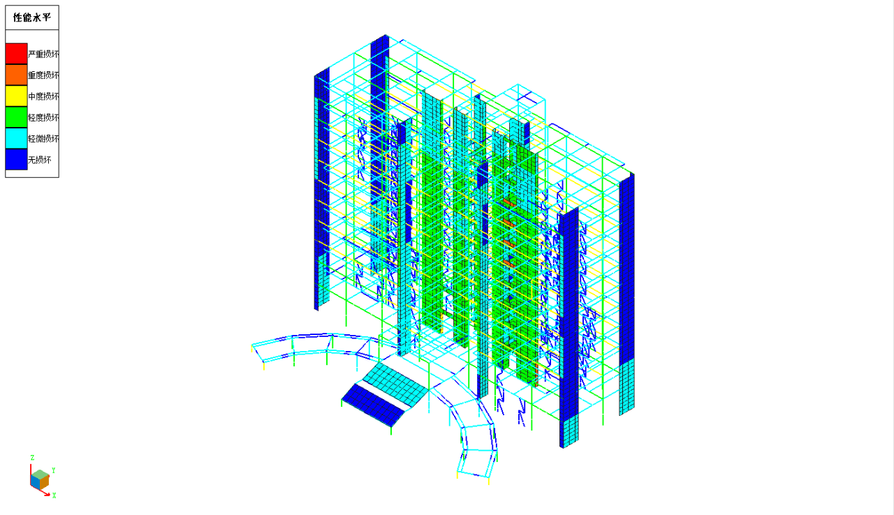 3.罕遇地震下,除一層個(gè)別短墻損傷較重外,其他墻體均在中度損傷以下,結(jié)構(gòu)梁柱損傷較輕,在中度損傷以下,結(jié)構(gòu)具有較大的安全儲(chǔ)備。
